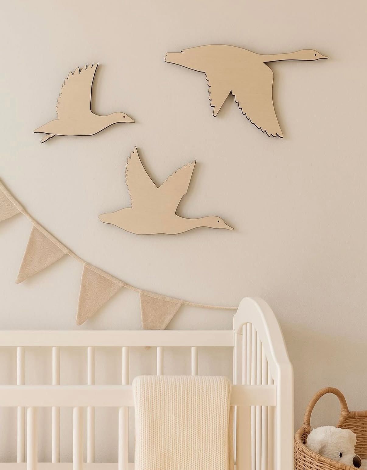 Diese drei liebevoll gelaserten Gänse aus Holz bringen eine natürliche, verspielte Atmosphäre ins Kinderzimmer. Ob auf dem Regal, an der Wand oder als besonderes Geschenk zur Geburt. Die Gänse passen perfekt in moderne, skandinavisch angehauchte Baby- und Kinderzimmer.